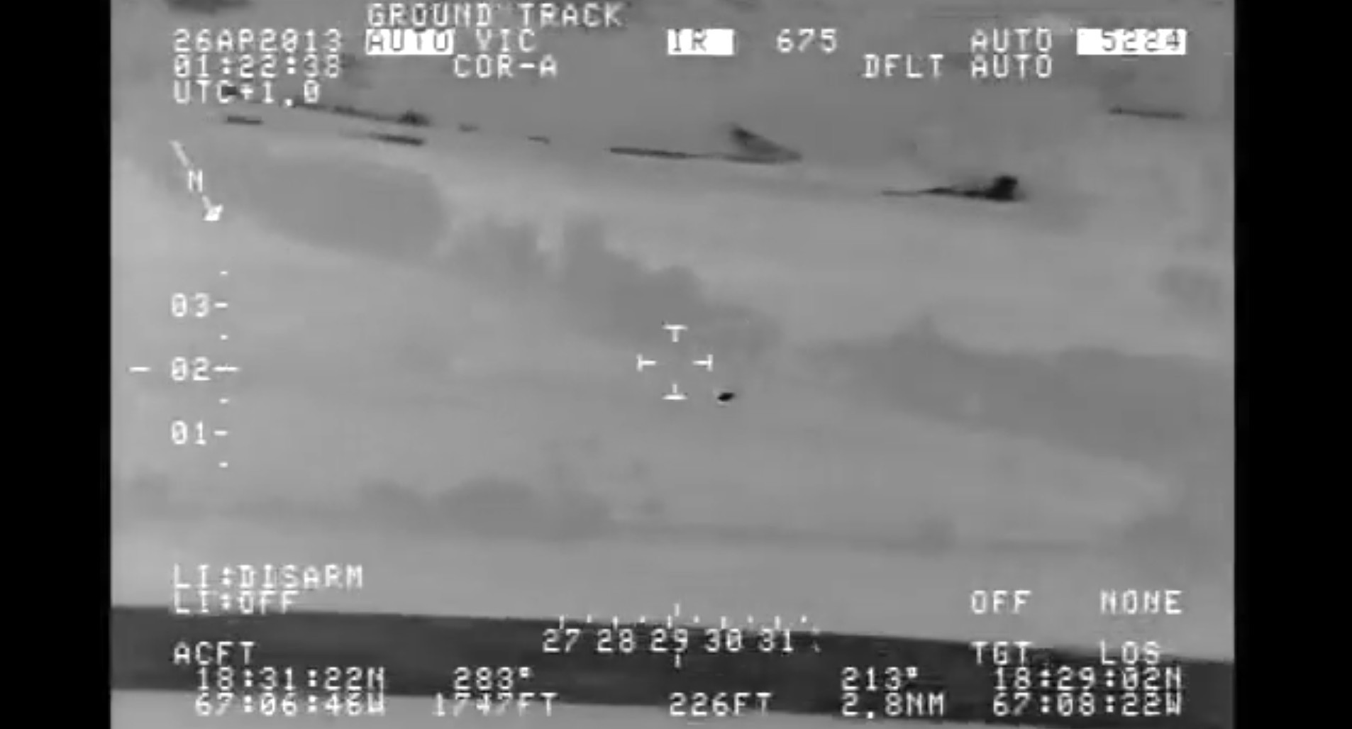 In January 2015, a U.S. Navy F/A-18F pilot recorded an object using a Forward Looking Infrared (FLIR) sensor about 13,000 feet above the Atlantic Ocean off the coast of Florida.
